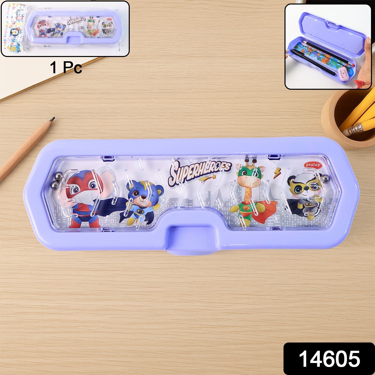 Cartoon Character Printed Plastic Pencil Box with Built-in Maze Puzzle Game (1 Pc)